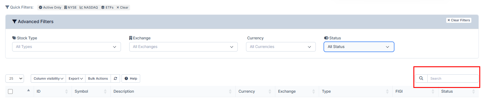 4. Use search to look for the stocks you require. As well you can use the filters such as "Stock Type", "Exchange", "Currency" and