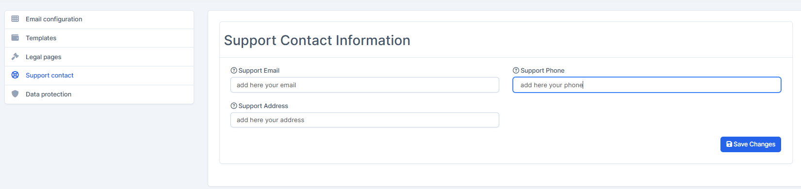 3. Choose "Support Contact", fill in the required fields and press on "Save Settings".