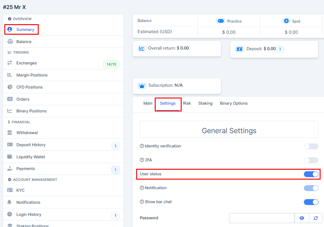 4. Go to "Summary" and inside press on "Settings" and choose "User status".