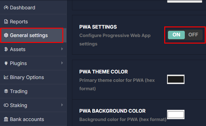 6. Press on the "General Settings" tab, find "PWA Settings" and enable it.