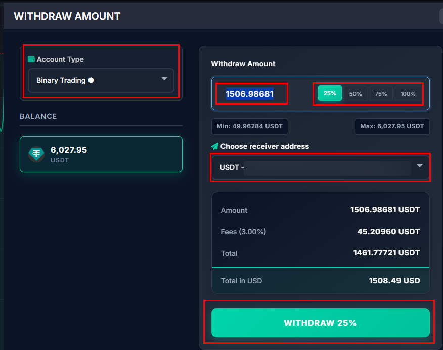 2. Choose "Binary Trading", Amount, Receiver Address, as well you can choose the quick amount percent. Press on "Withdraw" to complete the action.
