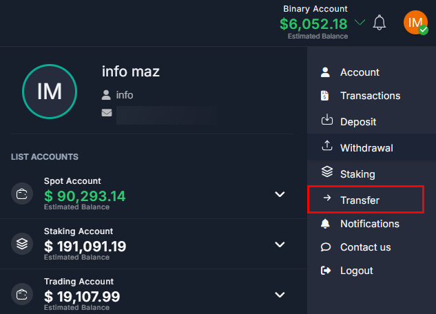 1. To transfer funds between your accounts from Binary Account press on your account type. Choose "Transfer".