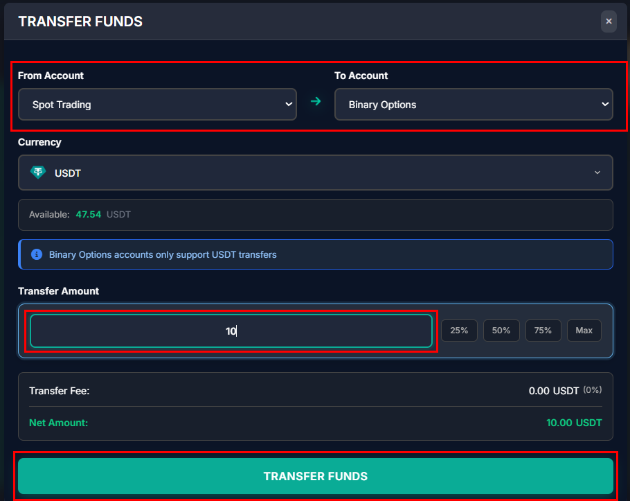 2. Choose from/to which to what account to send the funds to/from Binary. Choose the amount and as well you can choose the quick amount percent. Press on "Transfer Funds" to complete the action.