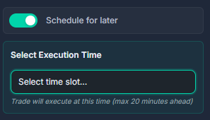 Schedule for later - will help you to choose a timeframe in future. Up to 20 mins ahead within the set time frame above (e.g. 10 seconds).