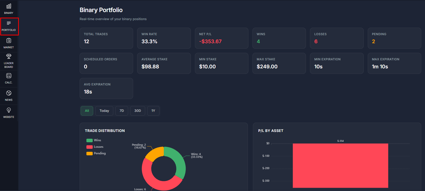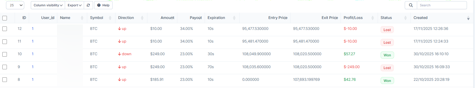 As a result in the History you will see the previous bidding history and current result. Completed deals with results, entry/exit prices, expiry and P&L. Open Positions – active trades with status (Active/Won/Lost) and current P&L. Scheduled – queue of pending orders (visible only with permission).