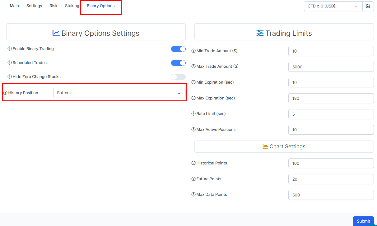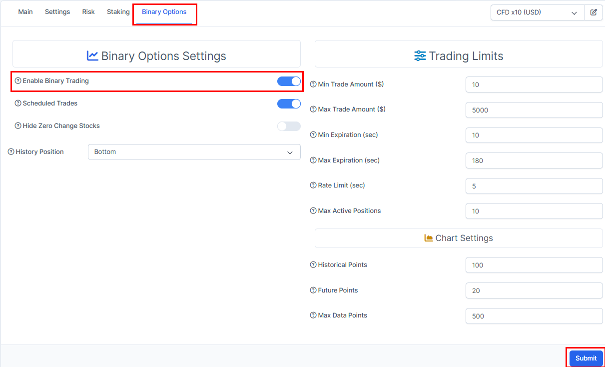 5. Press on "Binary Options". You will be able to set the options there. Once done, make sure to press on the "Submit" once you set the required options.