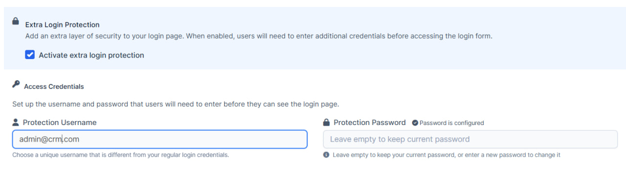 This will provide an additional layer of protection for your CRM. For example, you will need to enter a PIN code before accessing the office. The code can be changed.