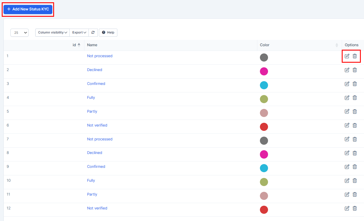 3. There you will be able to find "Statuses", edit or delete them and create "Add New Status KYC".