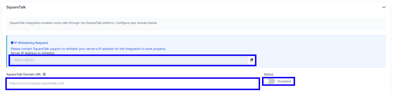 SquareTalk integration enables voice calls through the SquareTalk platform. Configure your domain below.