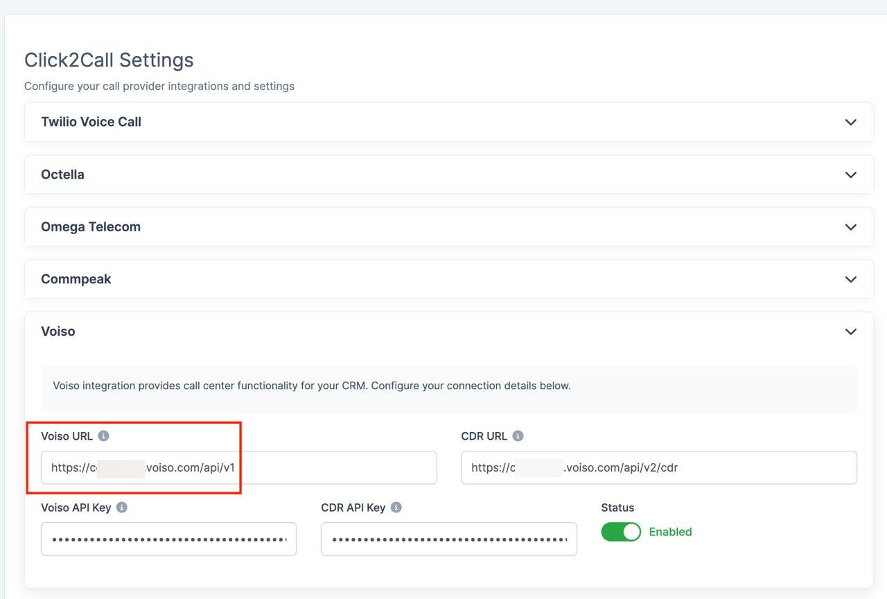 Voiso integration provides call center functionality for your CRM. Configure your connection details below.