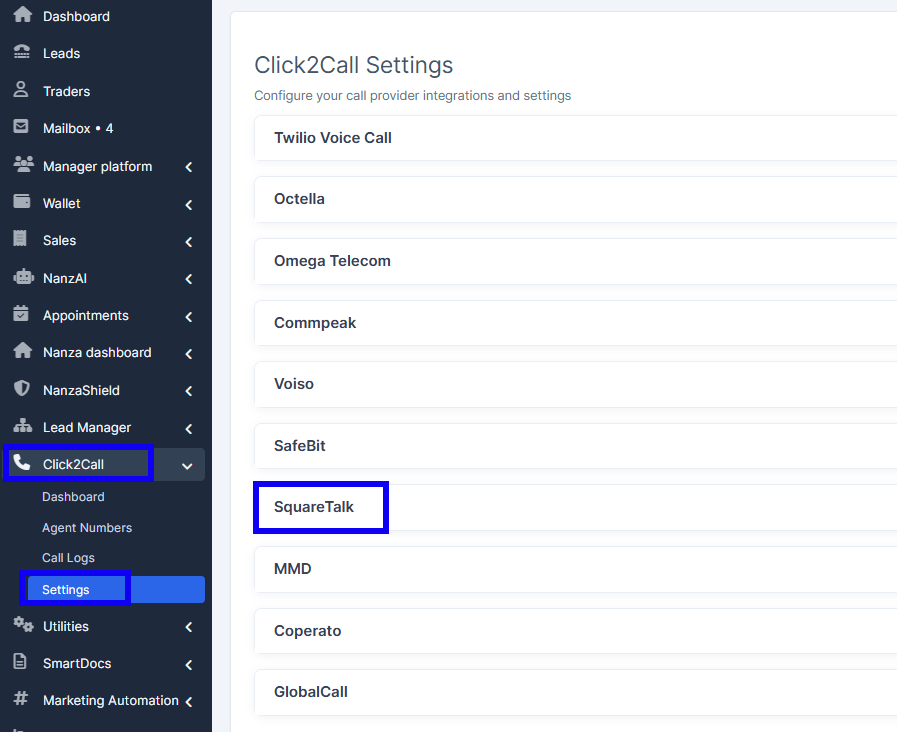 1. Head over to the "Click2Call" in the left menu. Choose the "Settings" and choose your provider. Choose "SquareTalk".
