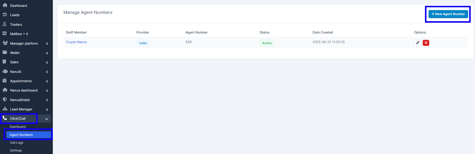 1. Head over to the "Click2Call" in the left menu. Choose the "Agent Numbers" and press on the "New Agent Number" .
