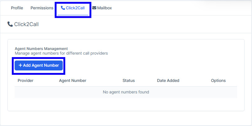 4. Press on "Click2Call" and then to "Add Agent Number".