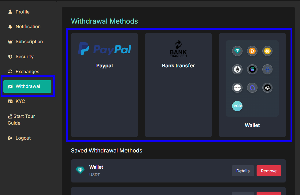 2. Scroll down to the "Withdrawal methods" section. Toggle these methods on or off to your preferences. Click "Submit" to save the changes.